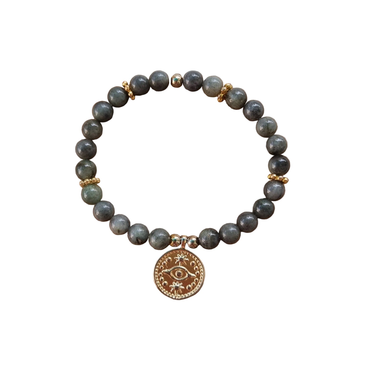 Magnifique bracelet SYDNEY avec perles en Labradorite grises de 6mm sur fil de nylon élastique.